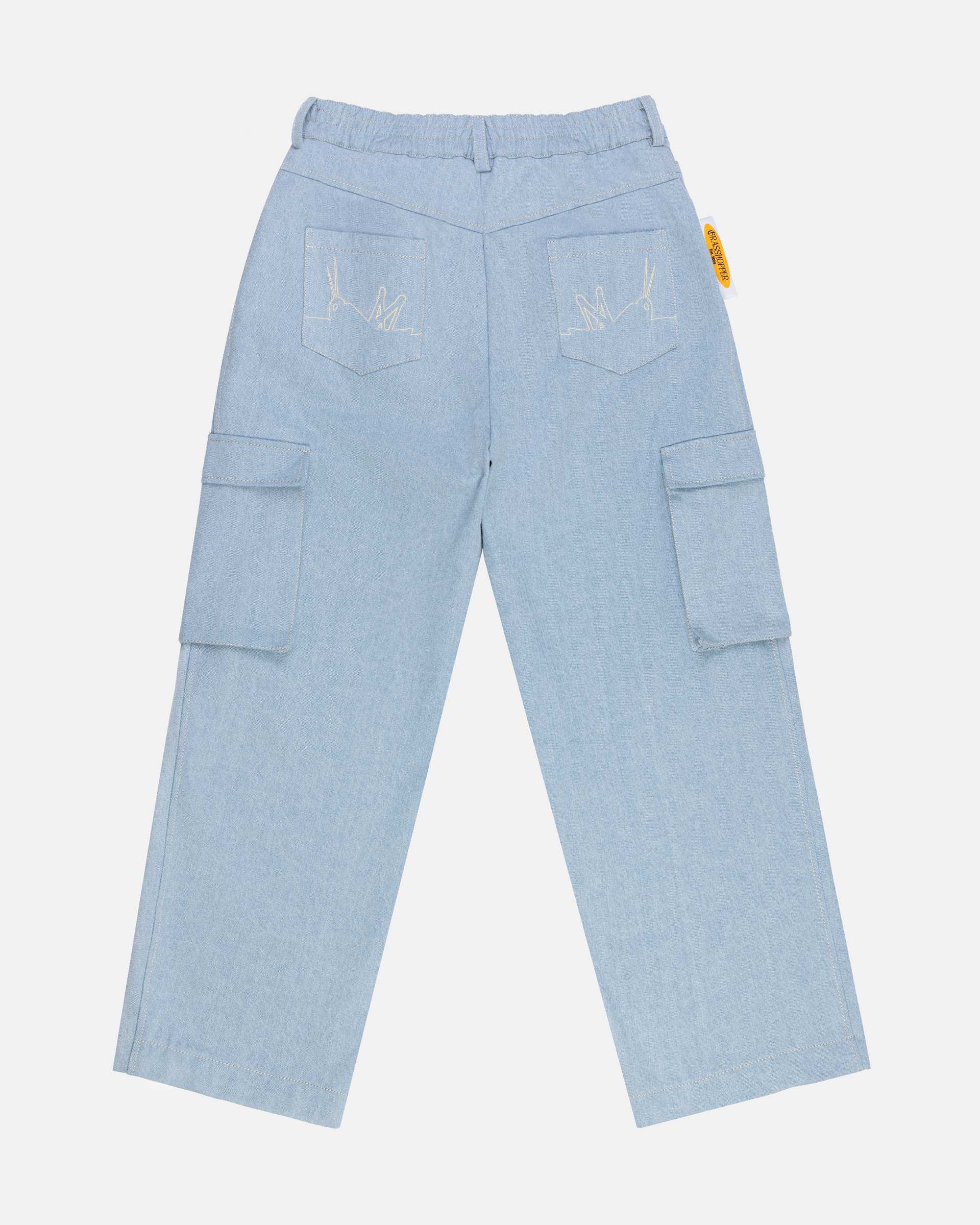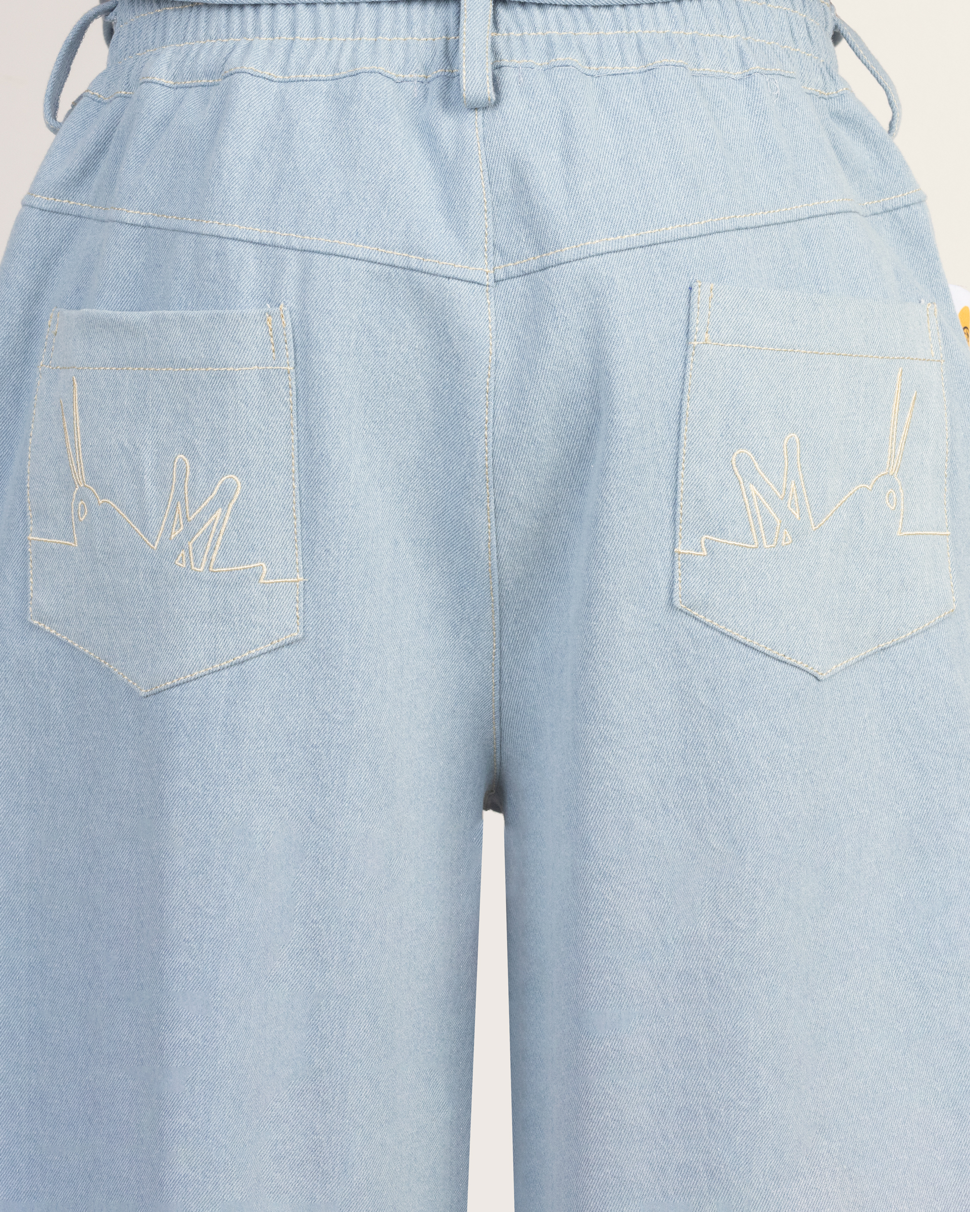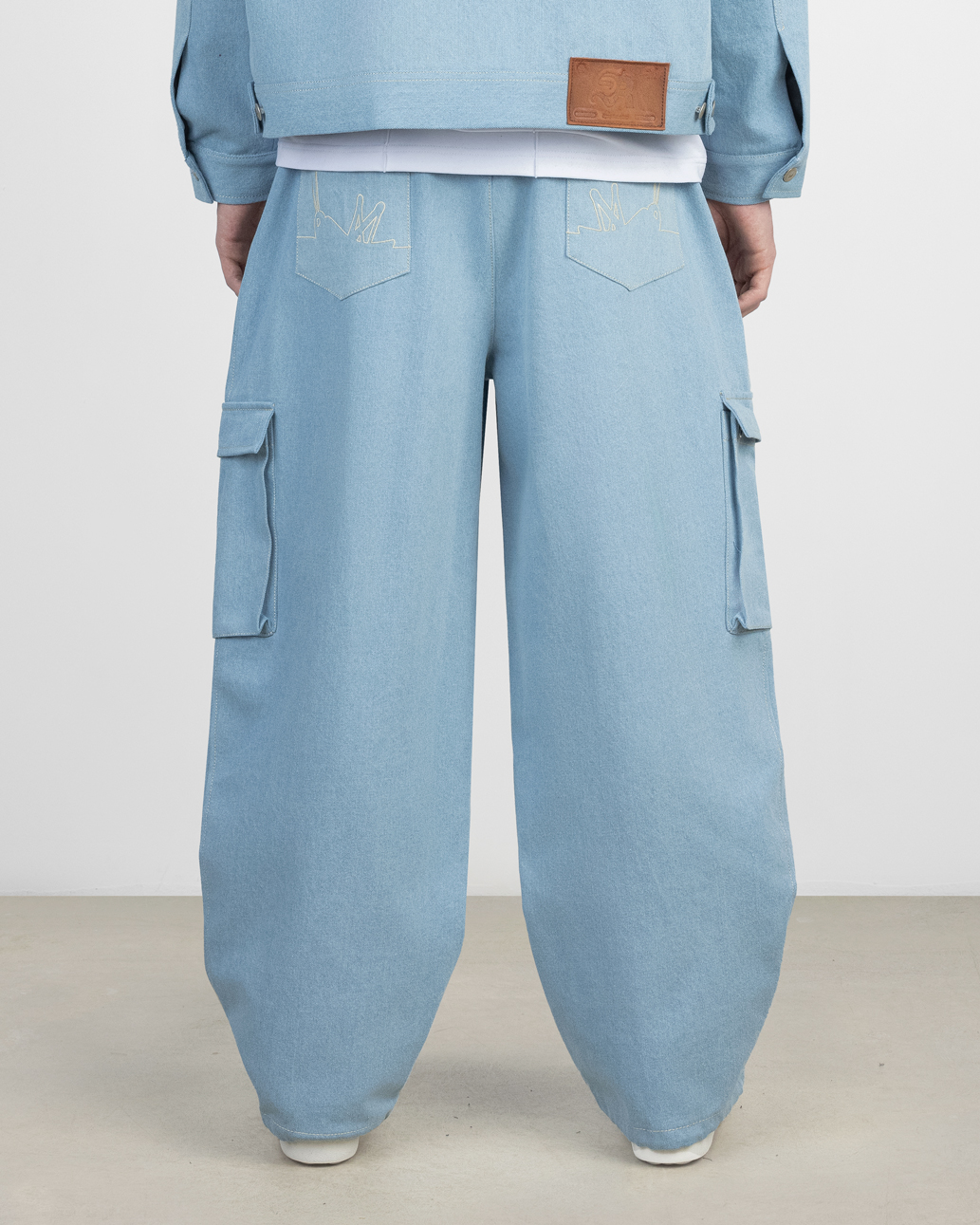 Широкие брюки выполнены из джинсовой ткани. В нижней части изделия расположены резинки с кулиской для регулирования ширины брючины. По бокам пришиты накладные карманы. Сбоку справа в шве расположена тематическая вставка из микробеклайта.