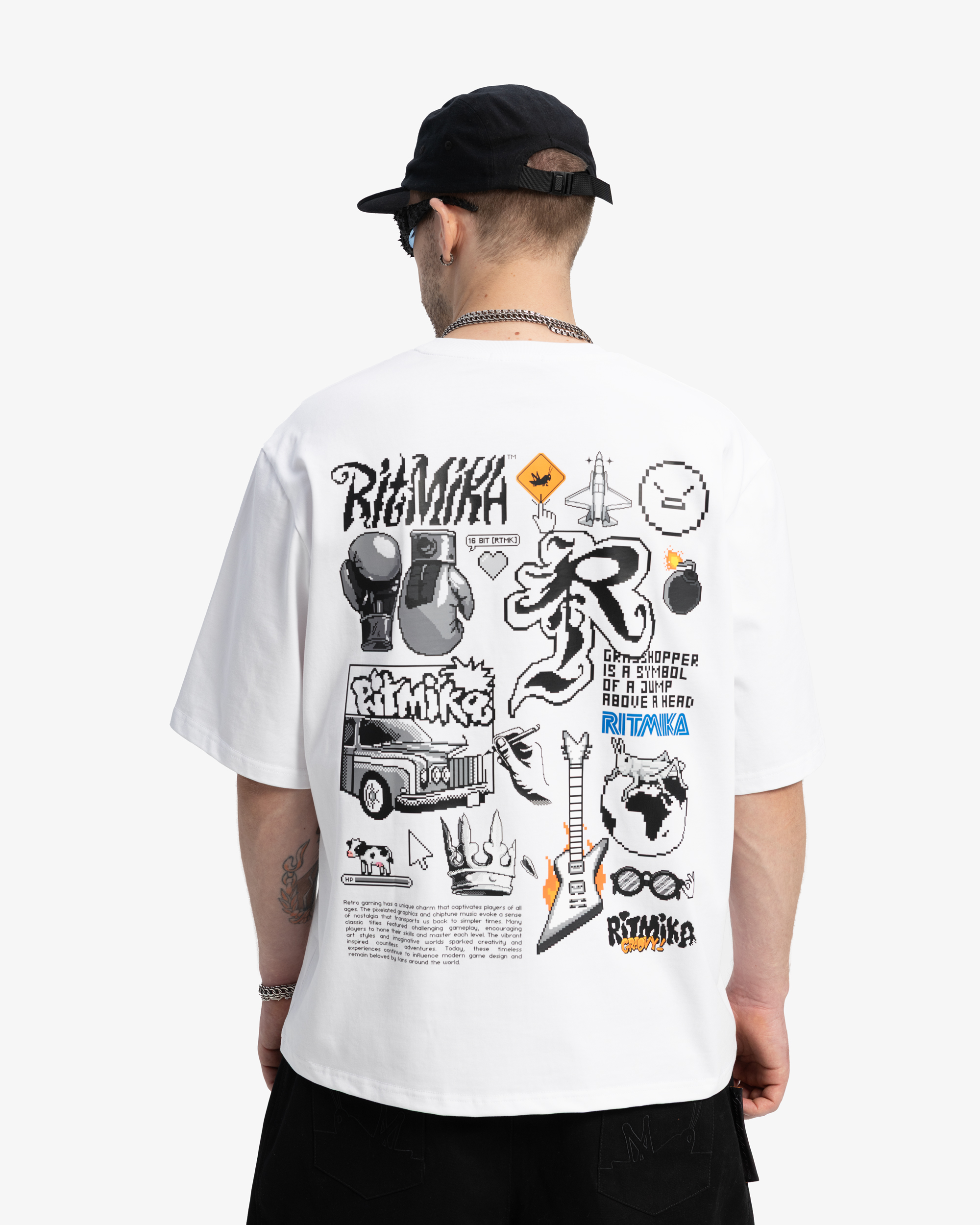 Эта футболка из дропа 16 BIT. За основной референс для дропа мы взяли три игры: Earthworm Jim, Comix Zone, Street Figher. Принт на спинке изделия отсылает сразу ко всем трем играм. Отгадаете, какой элемент к какой игре относится? :)