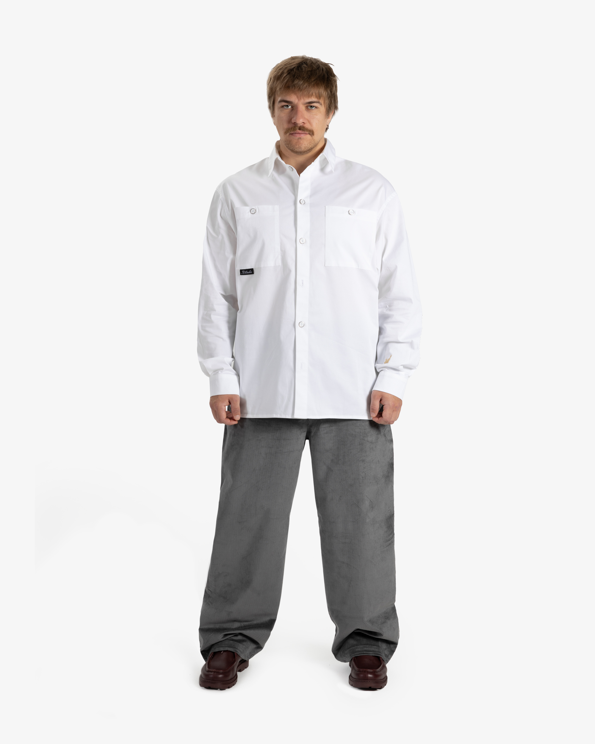 Рубашка выглядит официально, как сорочка для офиса, но сохраняет присущие бренду характерные детали — вышивка кузнечика и контрастный жаккард — напоминают о том, что даже в строгом образе можно оставаться верным своим принципам и стремиться к «прыжку выше головы».