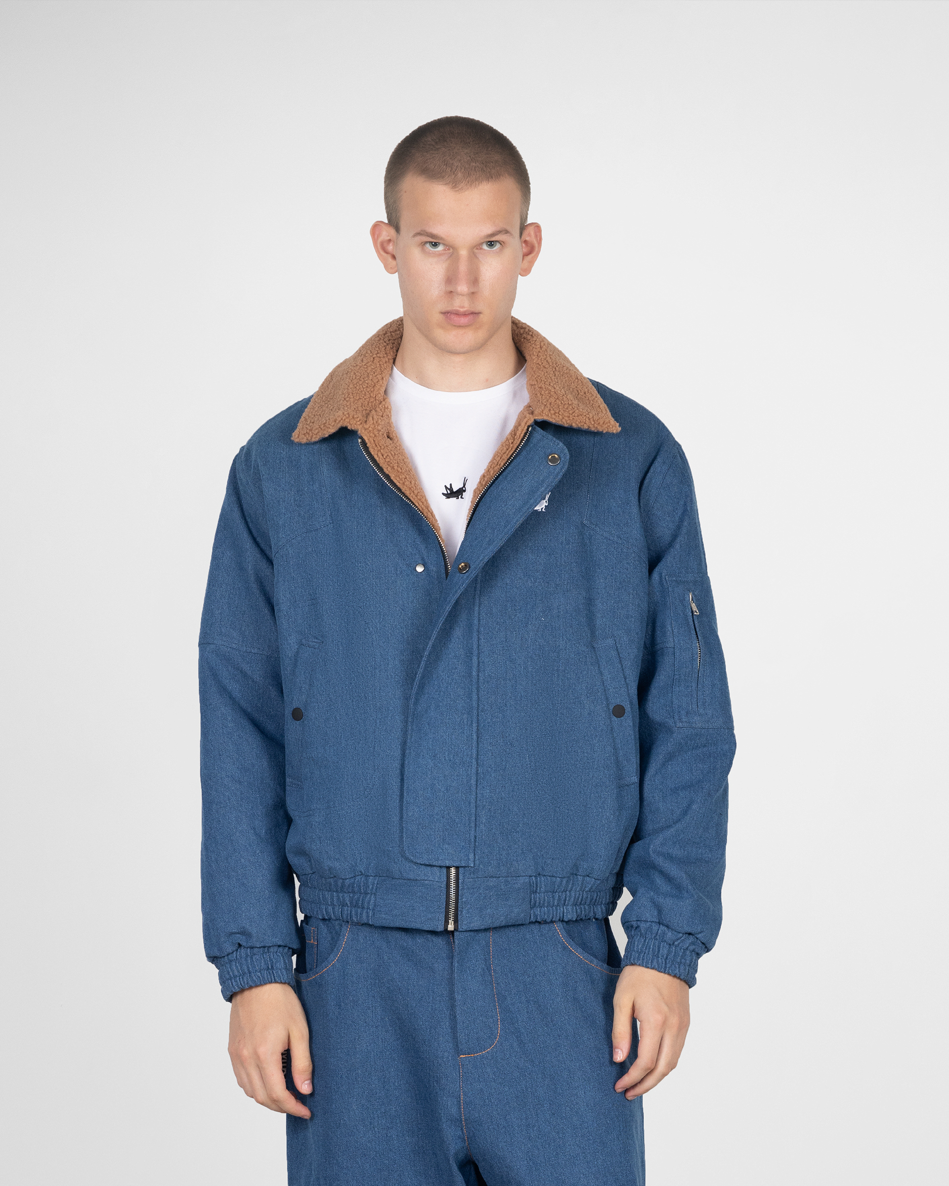 Джинсовая утепленная куртка с подкладкой из шерпы. Поверх молнии расположена планка с кнопками. На левой стороне изделия вышит логотип бренда.