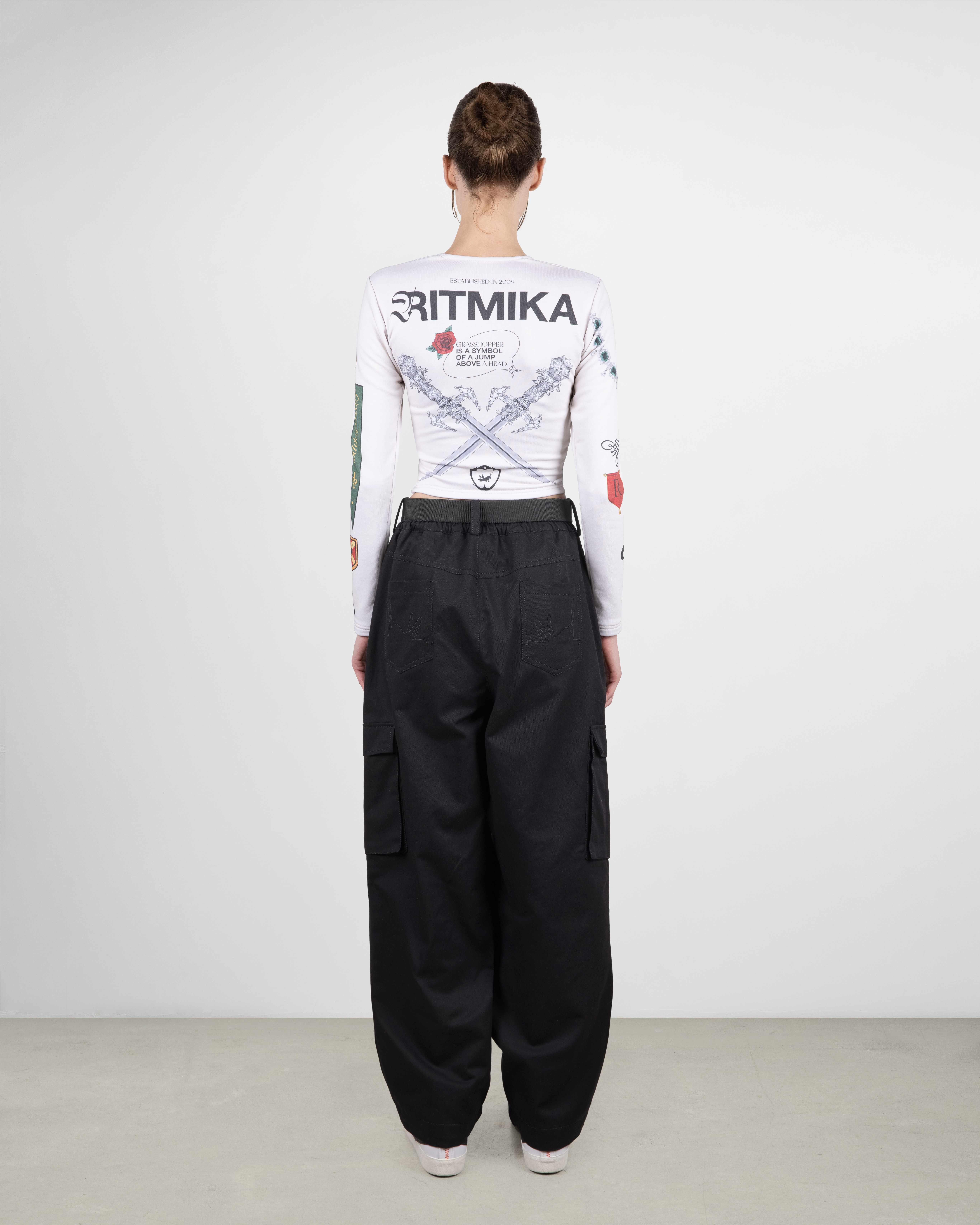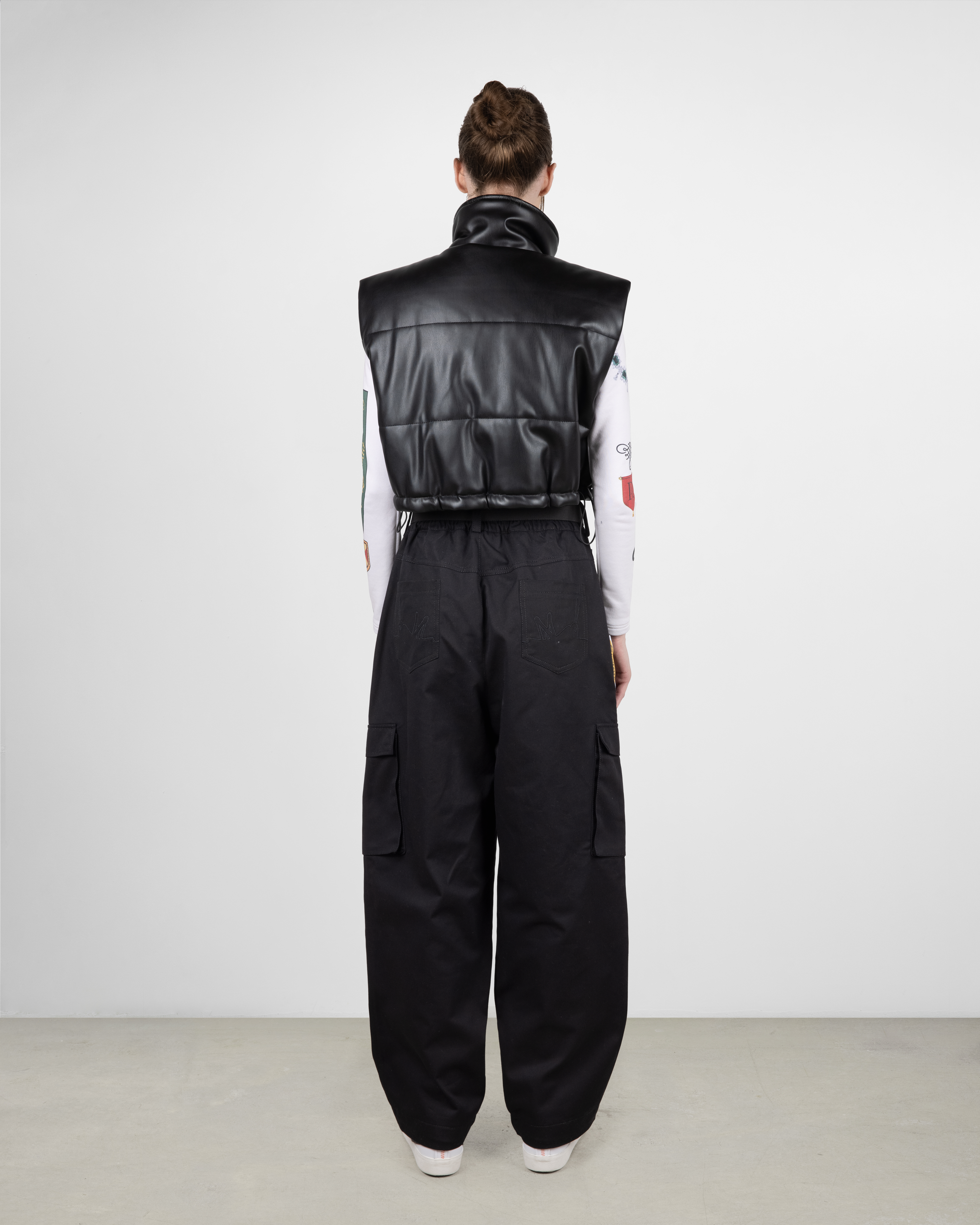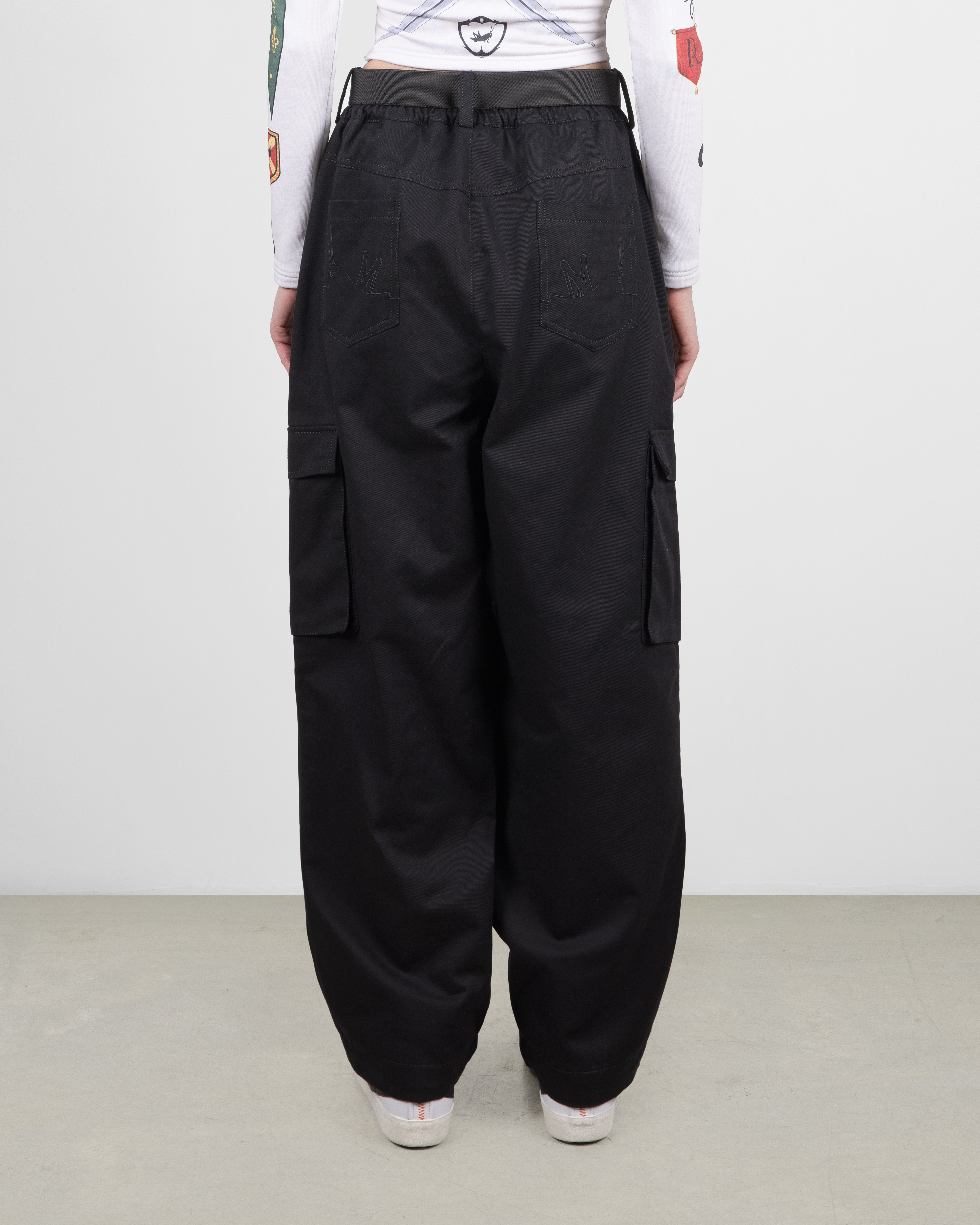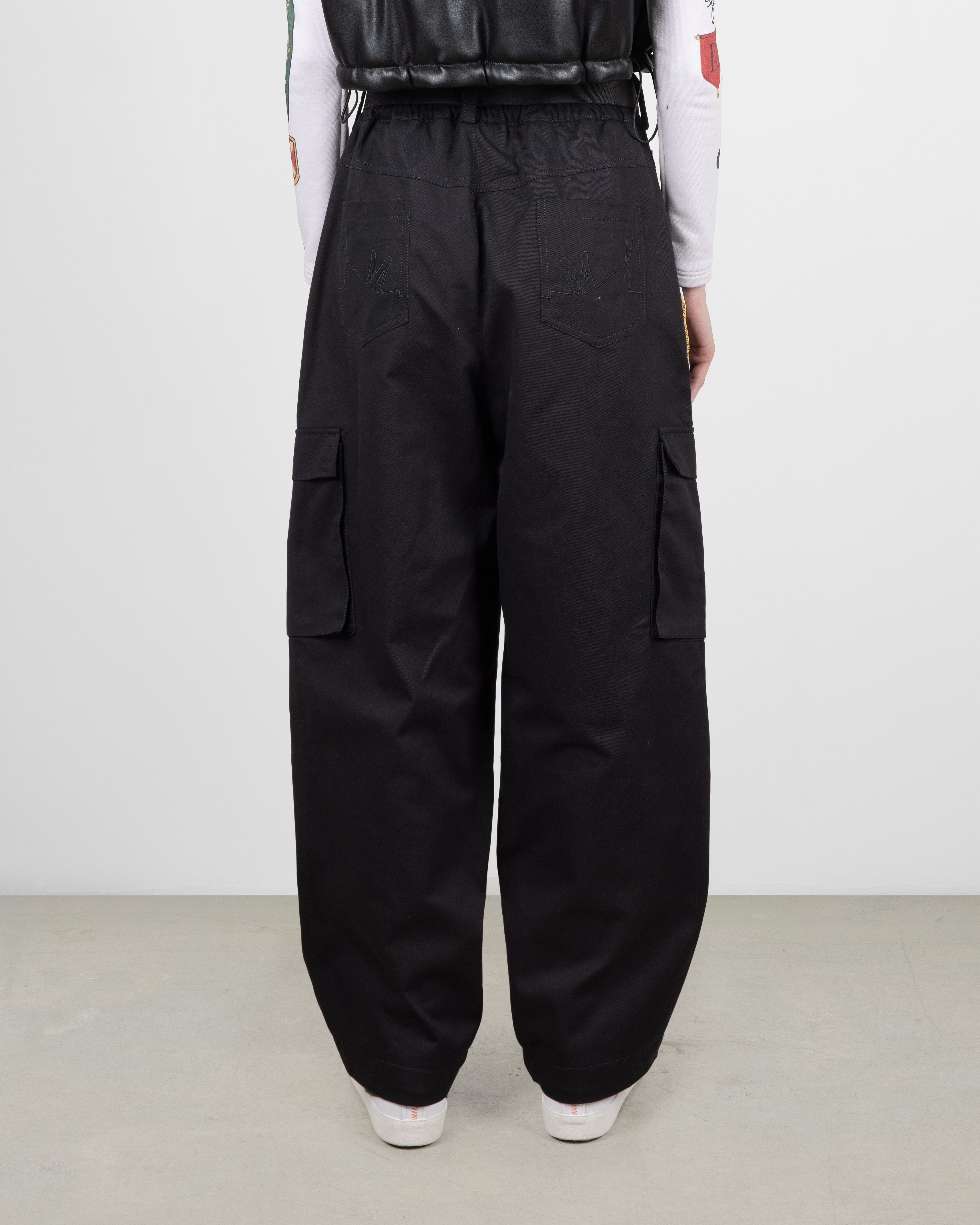 Широкие брюки выполнены из джинсовой ткани. В нижней части изделия расположены резинки с кулиской для регулирования ширины брючины. По бокам пришиты накладные карманы. Сбоку справа в шве расположена тематическая вставка из микробеклайта.